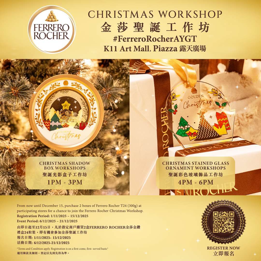 即日起至2025 年 12 月 15 日,凡购买两盒Ferrero Rocher金莎礼盒24粒(300克),即可于活动网站https://ferrerorocherhk.com/ 登记参加工作坊。工作坊名额有限,先到先得。