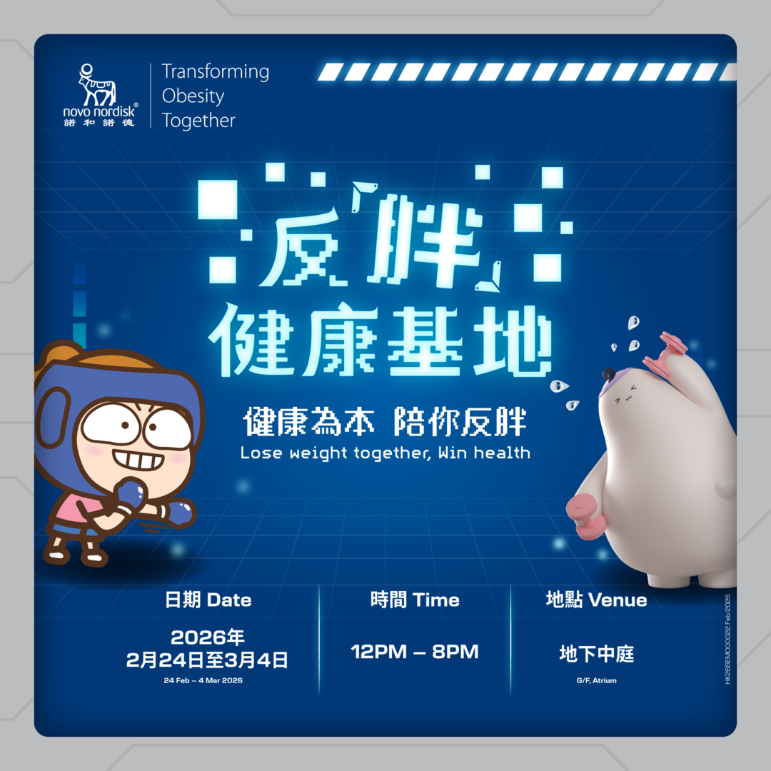 诺和诺德香港特别在K11 Art Mall设立「反『胖』健康基地」,诚邀大家透过新奇有趣的虚拟游戏及展品,一起揭开肥胖真相,学习「反胖」,智退健康威胁,展开一场维持健康体重的持久战!