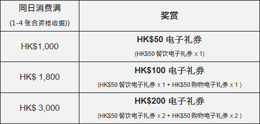 1. 同日累积消费金额是根据K11 Art Mall内之商户发出最多4张的合资格收据计算。每张合资格收据金额最少为港币50元,以K Dollar及/或K11实体/电子礼券及/或由商户发出之任何实体/电子礼券作消费之金额除外。