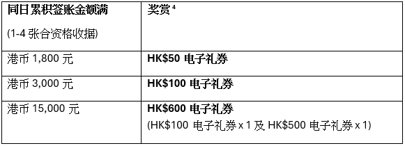 1. 同日签帐是由K11 Art Mall 之商户同日发出的最多4张合资格收据计算。所有签帐须以同一张合资格恒生信用卡进行交易(每张收据金额最少为HK$50 , K Dollar及/或K11 实体/电子礼券作消费者金额除外)