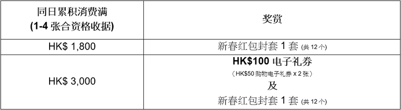 - 奖赏仅限于合资格交易当日兑换,且每位会员每日最多可换领奖赏的每个额度一次。奖赏及新春红包封套数量有限,先到先得,换完即止。图片只供参考。