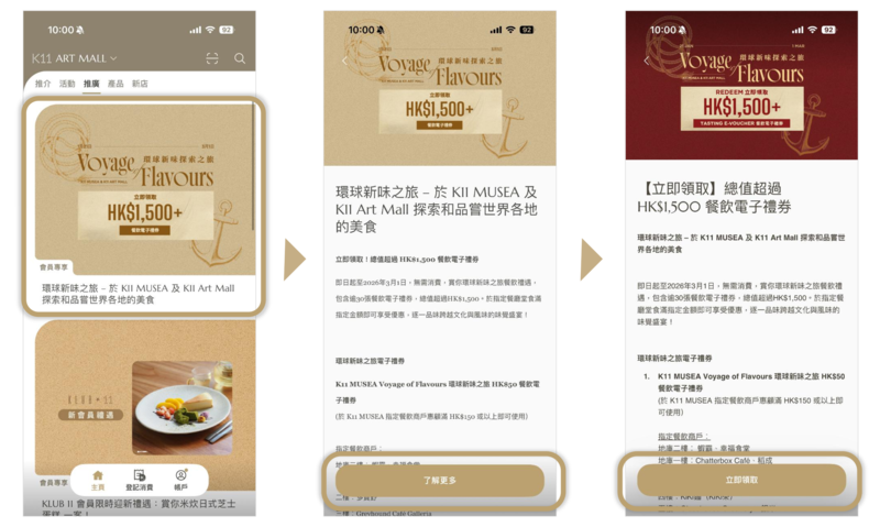 - 下載「K11 HK」APP,並登記成為KLUB 11會員,點擊環球新味之旅頁面