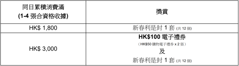 - 獎賞僅限於合資格交易當日兌換,且每位會員每日最多可換領獎賞的每個額度一次。獎賞及新春利是封數量有限,先到先得,換完即止。圖片只供參考。